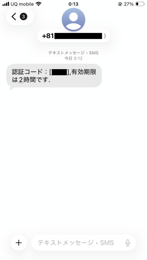 SMSで受信した認証コードを入力して、電話番号認証は完了です。