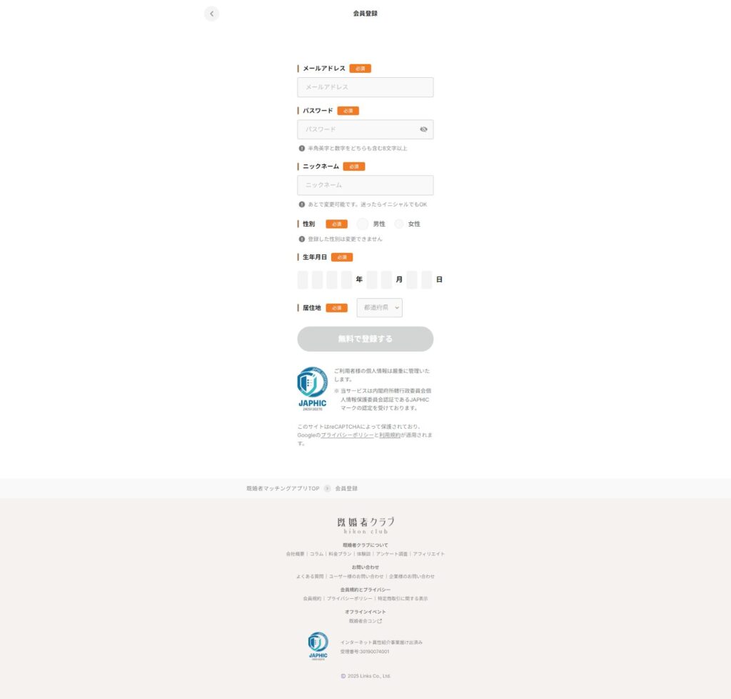 登録画面では、メールアドレスやパスワード、ニックネーム、性別、生年月日、居住地などの基本情報を入力します。なお、ニックネームはあとから変更可能ですが、性別は変更できないため、注意してご入力ください。